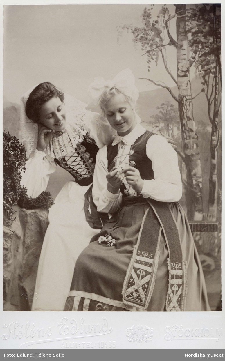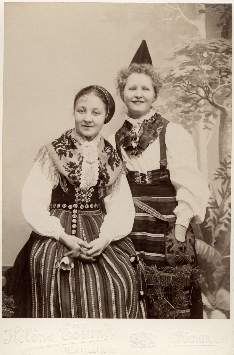 Ett foto på två kvinnor klädda i folkdräkt från Skåne eller Småland.