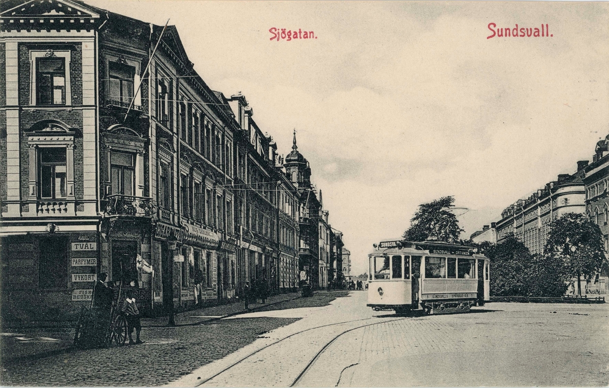 Spårvagn vid Sjögatan. Till vänster Justina Altins hus i korsningen mot Tullgatan. Vykort.