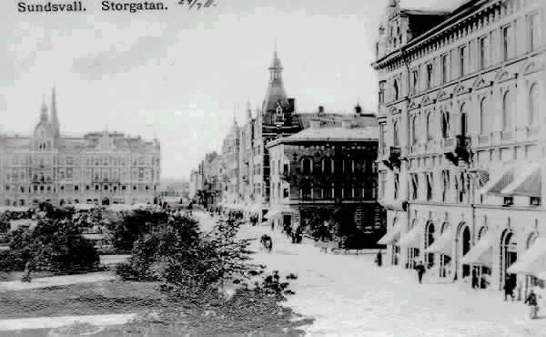 Från vänster kv Olympen 3-4/Kihlmanska huset, kv Jupiter 4 till höger i bild kv Proserpina 1/Sundsvalls handelsbank, kv Vängåvan/Park. På Storgatan spårvagn och fotgängare. Text till bild "Storgatan. Sundsv
